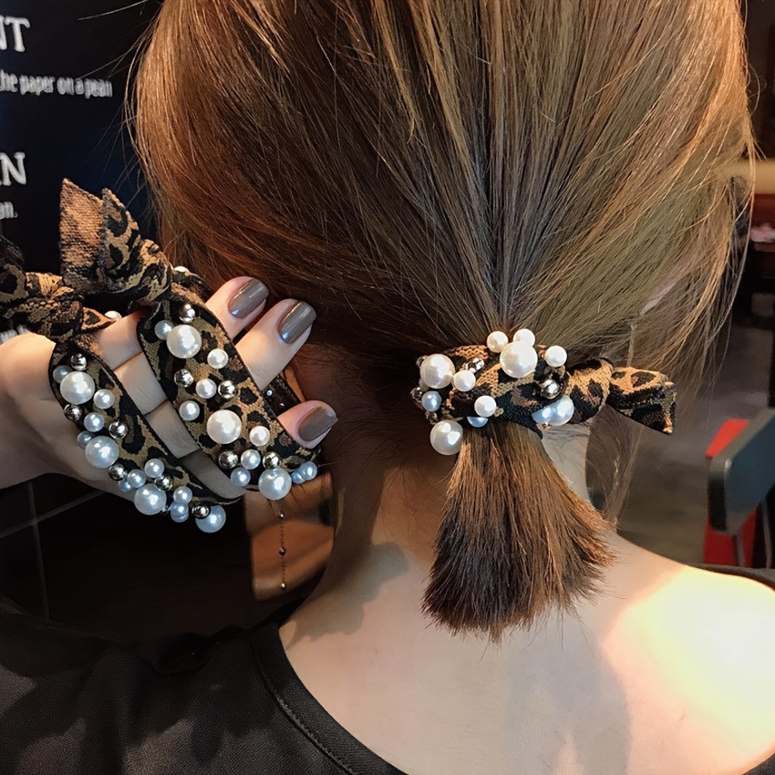 2pcs Leopard Print Square Rainbow Faux Pearl Rhinestone Hair Tie Fashion Ladies Scrunchie Hair Accessories Beauty Personal Care Temu
